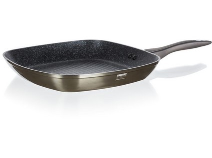 Hliníková litá kovaná steaková pánev METALLIC PLATINUM s nepřílnavým povrchem. rozměry: 28 x 28 x 4,8 cm vnější karbon metalický nástřik tloušťka stěny: 3 mm plně indukční dno soft-touch rukojeť Nepřilnavý povrch je velmi tvrdý a odolný proti poškrábání.Pánev je odolná proti nárazu a deformaci...