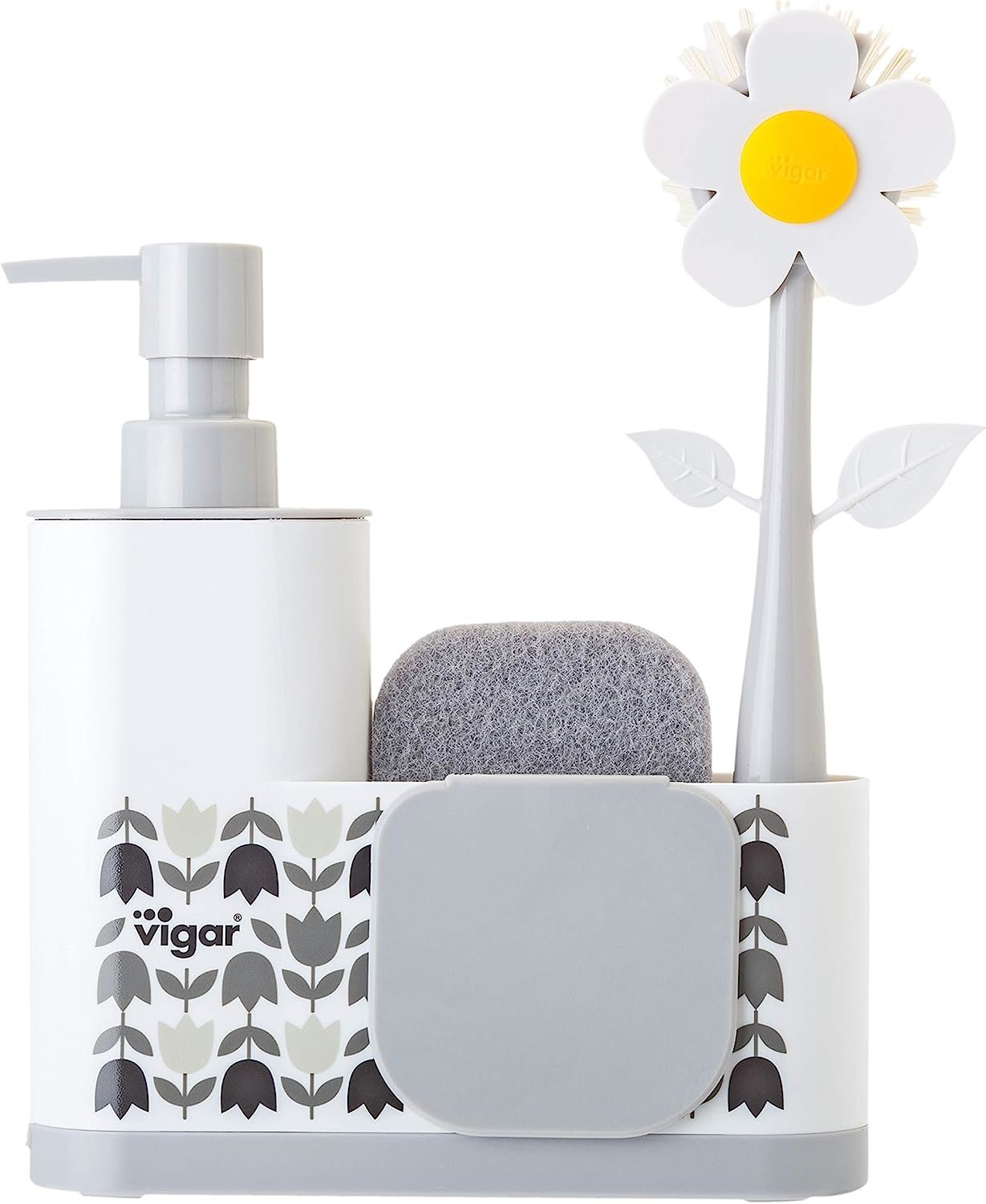 4dílná sada na dřez, včetně kartáče na drhnutí s motivem kytička, oboustranné houbičky, dávkovače mýdla a škrabky.Sada je kompaktní, víceúčelová sada na mytí nádobí, která je navržena tak, aby udržovala pracovní desku přehlednou a bez nepořádku. Tato praktická sada výrobků, kterou definuje...