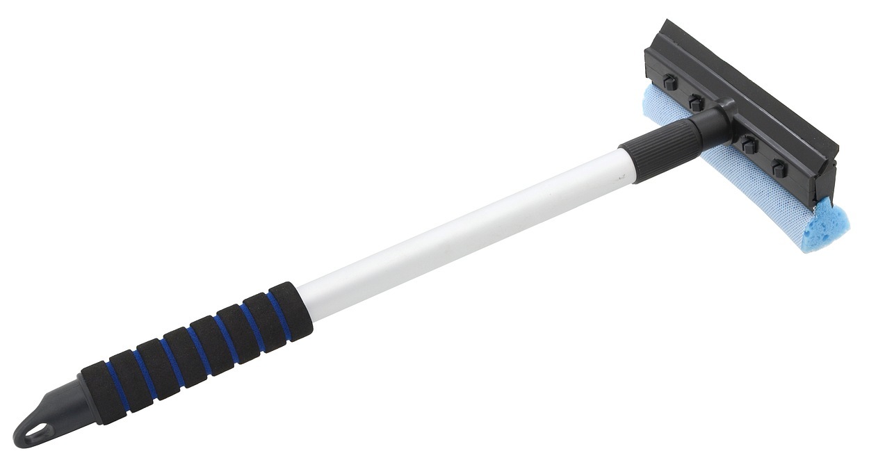 Praktická stěrka s břitem a houbou, vybavená teleskopickou násadou. Stěrka je vybavena břitem z měkké pryže a žlutou, síťovinou opatřenou houbou šíře 20 cm.