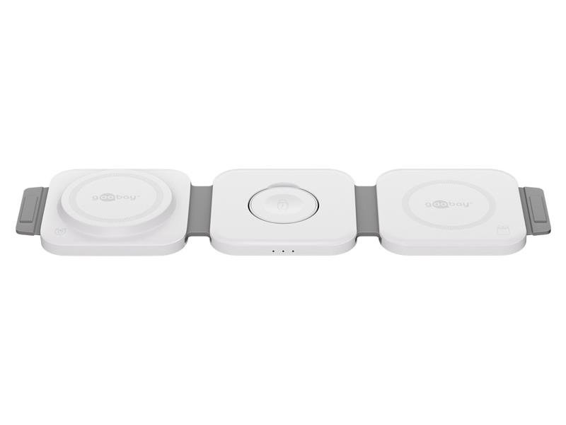 Nabíjecí řešení 3v1 je dokonalým společníkem na cesty a zaujme svou flexibilní funkcí skládání pro ultrakompaktní formát, který se vejde do každé kapsy. Spolehlivá magnetická technologie zajišťuje, že zařízení vždy bezpečně spočívají a proces nabíjení není přerušen. Oproti běžným podložkám má nabíjecí podložka smartphonu zvýšený povrch pro ideální nabíjecí kontakt i přes vyčnívající fotoaparát telefonu – s ochranným krytem i bez něj.