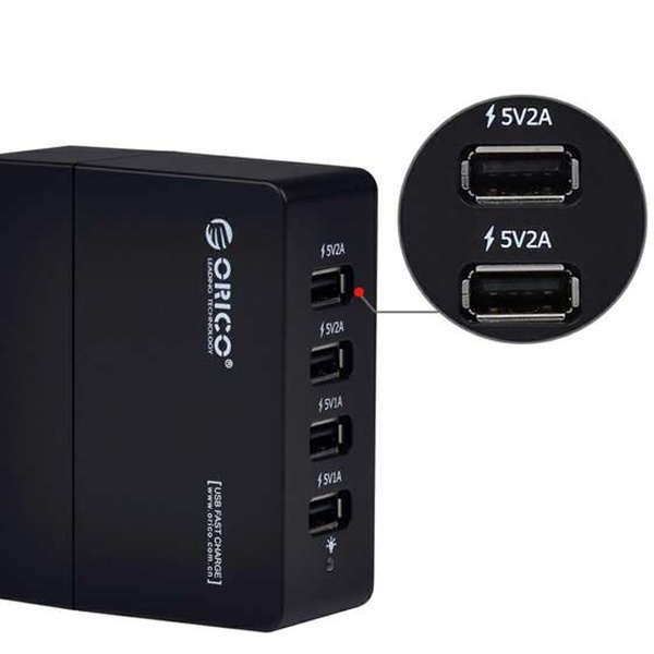 Čtyřportová USB nabíječka do zdi v černé barvě s rychle nabíjecími porty. Ideální pro cestování a použití v domácnosti.