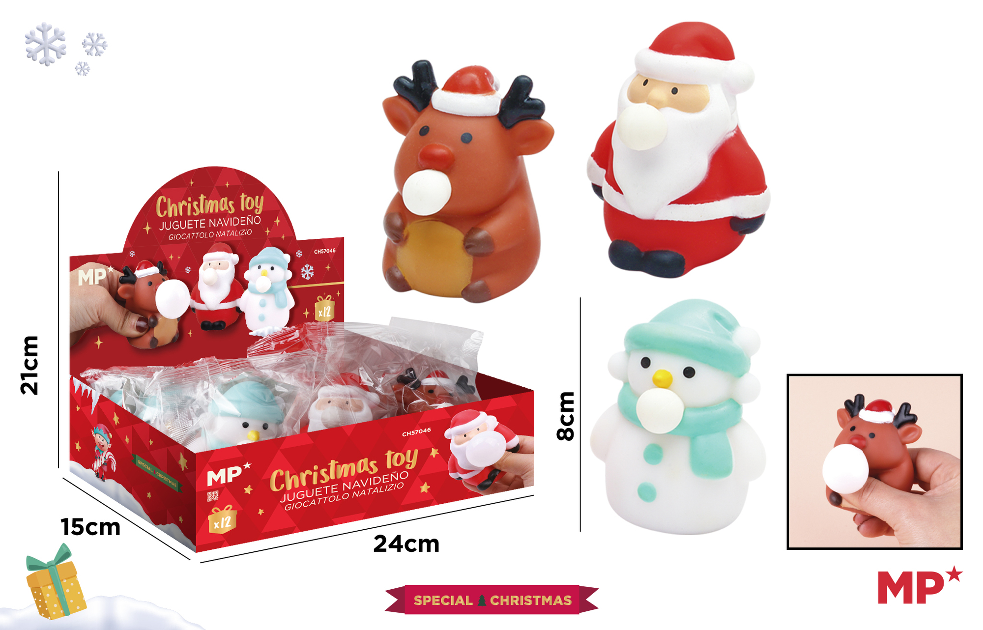 Gniotek antystresowy z motywem świątecznym Wymiary: 6 × 7,3cm.Postacie o tematyce bożonarodzeniowej, o żywym, realistycznym wyglądzie. Gniotki można ustawić w pozycji pionowej. Po naciśnięciu brzuszka z ust wydobywają się bąbelki, a następnie gniotek powoli wraca do swojego pierwotnego kształtu....