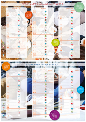 Wer bringt den Müll raus? Wer ist diese Woche mit Putzen dran? Wer muss lernen? Der WG-Planer bringt Ordnung in das tägliche Chaos einer WG und sorgt für gute Stimmung. Er enthält einen A2-Kalender mit Wochenplan für 6 Monate zum Eintragen anfallender Termine und Zuständigkeiten. Sechs Türhänger mit Aufgabenstellungen oder Kurzmitteilungen komplettieren den WG-Planer auf lustige Weise.