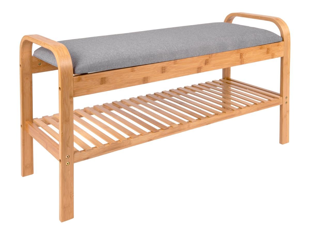 Lavice bambusová s šedou látkou a jednou policí-botníkem.