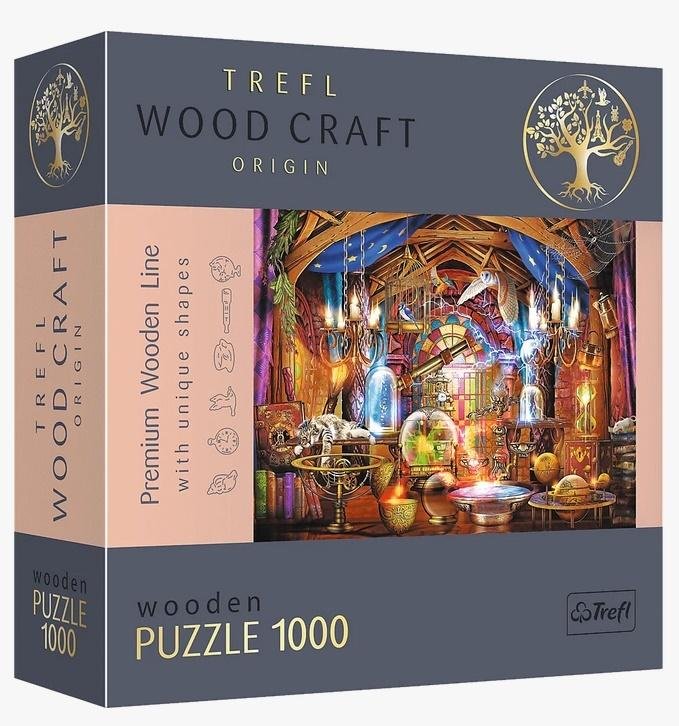 Seria puzzli 1000 elementów jest idealna dla wszystkich miłośników układanek, pozwoli stworzyć obrazek o wymiarach 51,9 x 37,5 cm przedstawiający czarodziejską komnatę, miejsce uprawiania magii i czarów. Układanka została wykonana z drewna, a opakowanie przyjazne środowisku w całości z tektury. Puzzle zawierają nieregularne elementy oraz 100 figurek w kształcie zwierząt.
