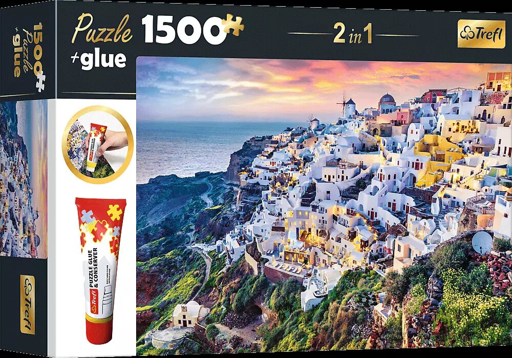TREFL Sada 2v1 puzzle Nádherný ostrov Santorini, Řecko 1500 dílků s lepidlem