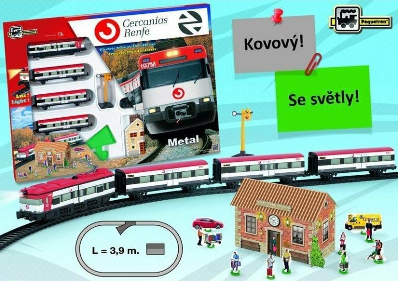 Kovový osobní vlak na baterie se světly, 3 vagóny a železniční stanicí. Vlak jezdí po trati dlouhé 3,9 m. Cercanías je španělský osobní vlak provozovaný španělskou železniční společností Renfe. prečítať celé
