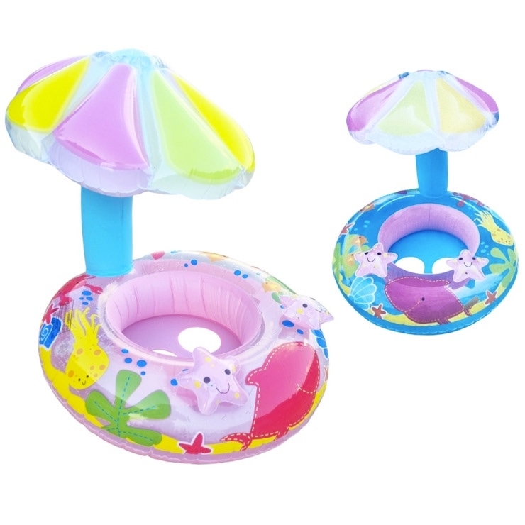 Užij si léto plnými doušky. Dětský nafukovací člun se slunečníkem a otvory na nožičky. Možnost výběru ze dvou barev - modrý nebo růžový. prečítať celé