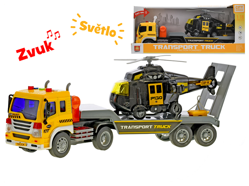 Auto nákladní 38cm na setrvačník na baterie se světlem a zvukem s vrtulníkem v krabičce