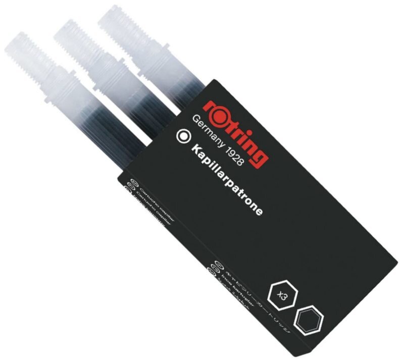 Naboje kapilarne do rapidografów rotring FZ nierozpuszczalnym czarnym tuszem specjalnym do wszelkich matowych folii i kalek kreślarskich. czarne (pakowane po 3 sztuki).Właściwości szczególne:Swobodnie wypływające, duży stopień pokrycia i przywierania, szybkoschnące, niepodatne na odciski palców...