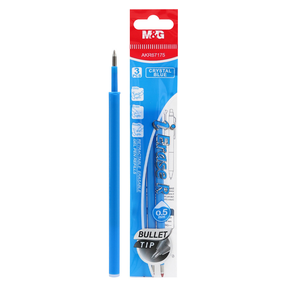 Náplň do oblíbených per značky M&G (napiš - vygumuj - přepiš).barva inkoustu: modráprůměr kuličky (hrot) 0,5 mmrozměr: 4 x 130 mm (průměr x délka)Balení obsahuje 3 ks náplní na blistru. prečítať celé
