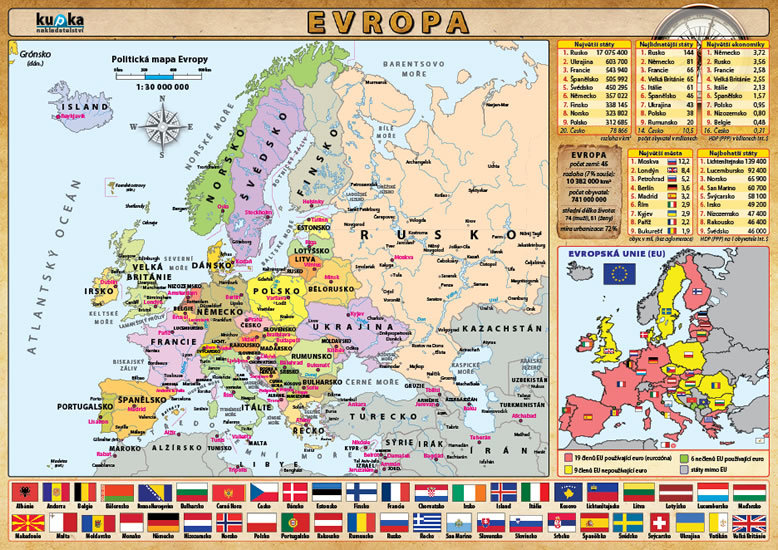 Politická a fyzická mapa Evropy včetně mapy Evropské unie. Obsahuje státní vlajky evropských zemí, tabulky s pořadím států podle různých kritérií a tabulku zeměpisných rekordů. prečítať celé