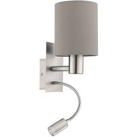 Nástěnné svítidloEglo Pasteri 96478Druh patice E27,LEDZdroj světla E27,LEDBarva LED teplá bíláMax. výkon (W) 1X40W,1X3,5WTřída energ. účinnosti FMateriál těla ocelBarva těla matný niklMateriál stínidla textilBarva stínidla šedohnědáDélka (mm) 150Výška (mm) 380Rozpětí (mm) 195Hmotnost (kg) 1.030