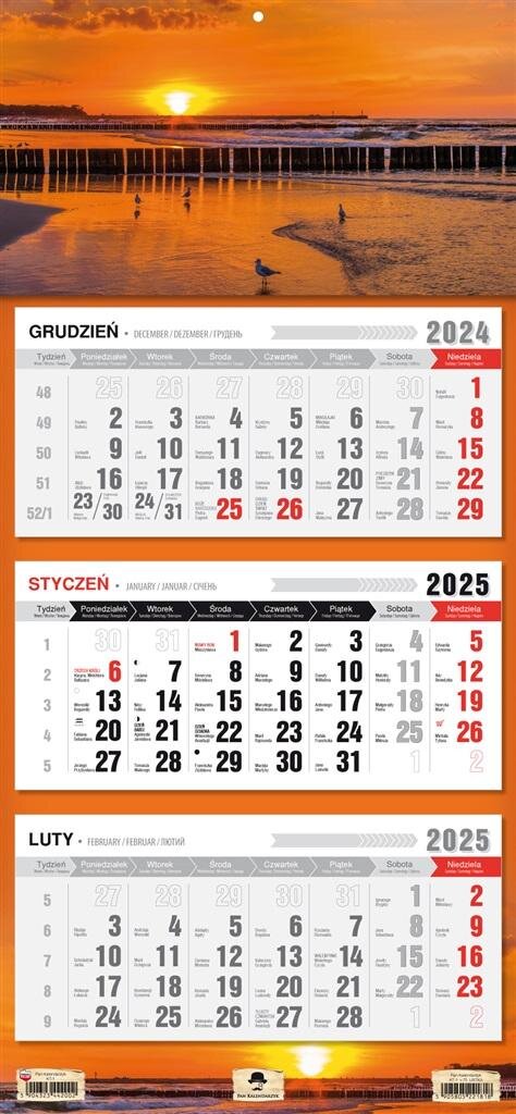 Kalendarz Trójdzielny z płaską główką. Format 315/680mm. Trzy komplety klasycznych kalendariów z przesuwnym okienkiem. Główka z otworem wierconym. Dodatkowo nazwy miesiąca i dni tygodnia w języku Ukraińskim, Angielskim i Niemieckim. Kalendarium dodatkowo zawiera fazy księżyca i znaki zodiaku. Dużo miejsca do notowania, czytelne duże litery i cyfry.