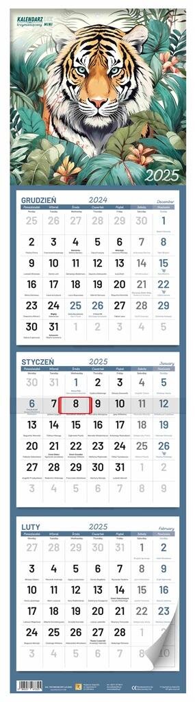 Kalendarz trzymiesięczny z okienkiem i wypukłą główką w dwóch różnych wzorach graficznych (kwiaty, tygrys). prečítať celé