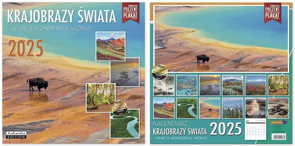 Kalendarz 2025 Krajobrazy Świata Kwadratowy kalendarz ścienny na rok 2025 z serii "Krajobrazy Świata". Każdy miesiąc cieszy pięknym zdjęciem, które będzie wspaniałą ozdobą Waszego domu. Kalendarz po rozłożeniu ma wymiary 30x60 cm - górny kwadrat wypełnia zdjęcie, a dolny kalendarium. PREZENT: w...