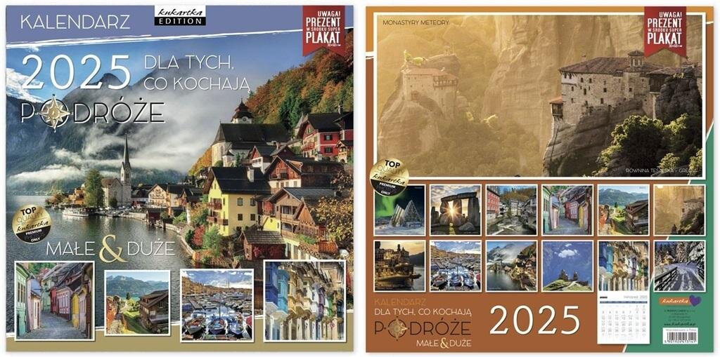 Kalendarz 2025 Podróże Kwadratowy kalendarz ścienny na rok 2025 z serii "Podróże". Każdy miesiąc cieszy pięknym zdjęciem, które będzie wspaniałą ozdobą Waszego domu. Kalendarz po rozłożeniu ma wymiary 30x60 cm - górny kwadrat wypełnia zdjęcie, a dolny kalendarium. PREZENT: w środku kalendarza...