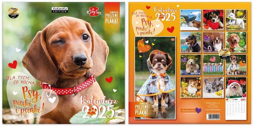 Kalendarz 2025 Psy, pieski i psiaki Kwadratowy kalendarz ścienny na rok 2025 z serii "Psy, pieski i psiak". Każdy miesiąc przyozdabia inny psiak, który będzie wspaniałą ozdobą Waszego domu. Taki kalendarz to idealny prezent dla miłośników psów. Kalendarz po rozłożeniu ma wymiary 30x60 cm - górny...