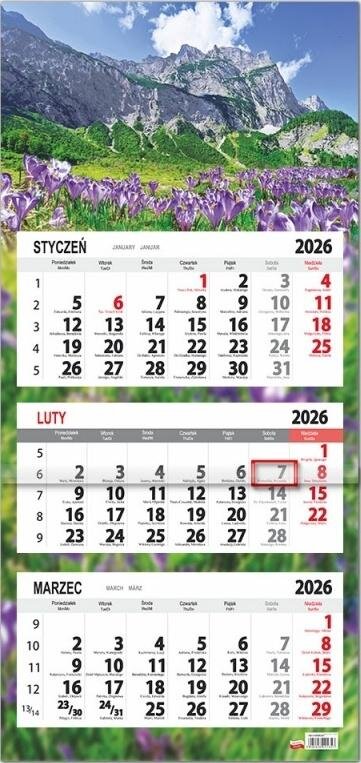 Format: kalendarza - 31,5 68 cm, główki - 31,5 20 cm, kalendarium - 29 14 cmUkład: 3 oddzielne kalendaria, miesiąc poprzedni, bieżący wyróżniony kolorystycznie i następnyDruk, papier: karton 300g/m2Kalendarium: w języku polskim, angielskim, niemieckim, podwójne imieniny,...