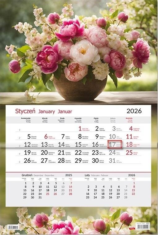 Format: kalendarza - 31,5 47,5 cm, główki - 31,5 21 cm, kalendarium - 29 21 cmDruk, papier: karton 300 g/m2 + folia błyszcząca kalendarium - offset 70 g/m2, 2 koloryKalendarium: w języku polskim, angielskim, niemieckim, podwójne imieniny, numeracja tygodni, pasek z...