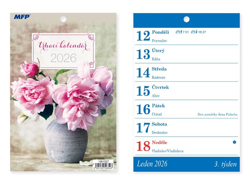 Kalendár 2026 v formáte A5 ponúka kvalitné týždenné listy, na ktorých nájdete všetky dôležité údaje pre ľahkú orientáciu v čase. Každá stránka obsahuje informácie o českých menách, štátnych sviatkoch či meninách, rovnako ako údaje o východe a západe slnka. Jemný kvetinový motív na úvodnej strane dodáva kalendáru decentný a príjemný vzhľad vhodný do domácnosti i kancelárie.