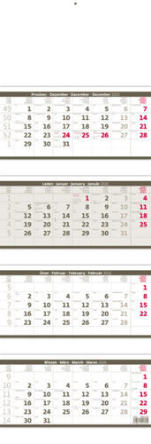 Tento kvalitný kalendár v rozmere 31,5 x 74 cm zobrazuje štyri mesiace naraz, čo vám umožní efektívne sledovať vaše plány a aktivity. Kalendárium obsahuje menné dni a sviatky nielen pre Českú republiku, ale aj pre vybrané európske štáty (Slovensko, Rakúsko, Belgicko, Nemecko, Francúzsko, Maďarsko, Švajčiarsko, Taliansko, Poľsko, Rusko a Ukrajina), čo oceníte pri medzinárodných kontaktoch alebo cestovaní.
