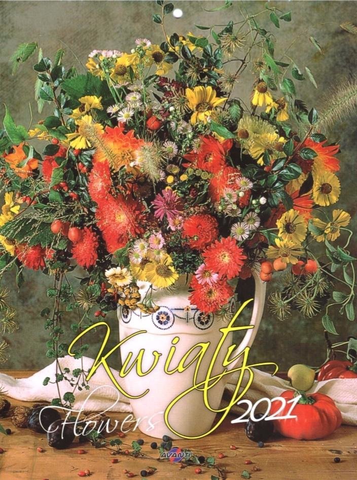 Kwiaty 2021Wygodny, niewielki kalendarz ścienny, drukowany na papierze kredowym.Co zawiera kalendarz?- 12 miesięcznych plansz- najpopularniejsze imieniny, popularne święta- godziny wschodu i zachodu słońca- fazy księżyca i znaki zodiaku- nazwy miesięcy i dni tygodnia po polsku, angielsku i...