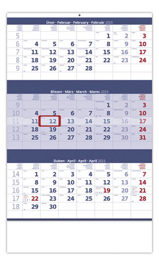 Kalendář nástěnný 2019 - Tříměsíční modrý (česky)