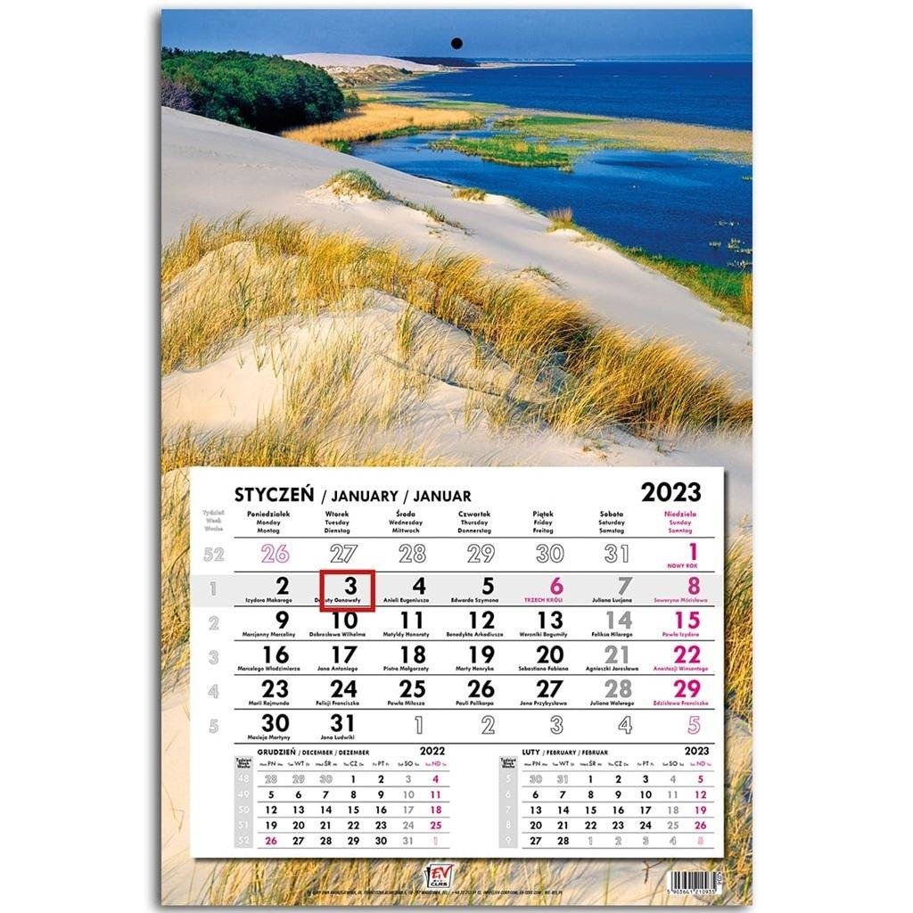 "* kalendarz ścienny, jednodzielny z główką płaską z zadrukiem na całych pleckach* wymiary: 31 x 48 cm* układ miesięczny z poprzednim i następnym miesiącem* posiada numerację tygodni, imieniny* nazwy miesięcy i dni tygodnia w języku polskim, angielskim, niemieckim* kalendaria w różnych kolorach...