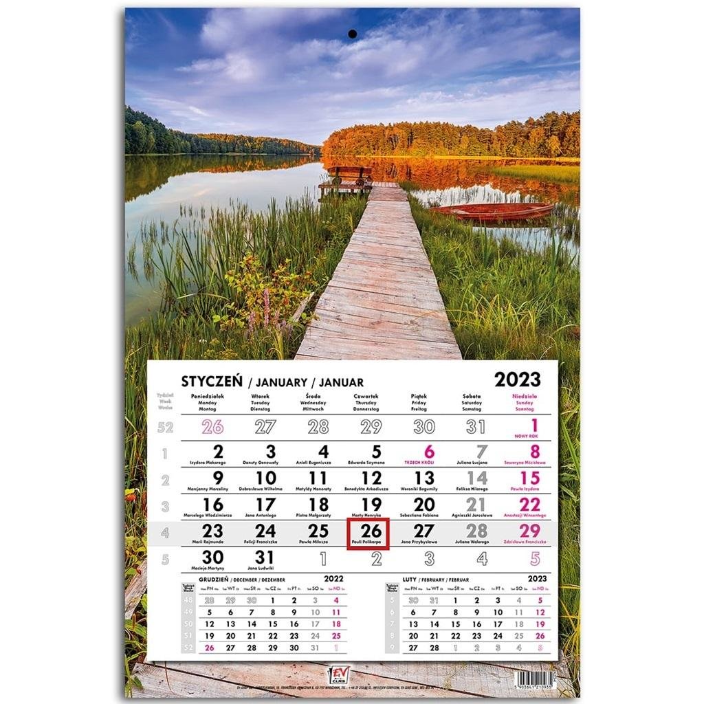 "* kalendarz ścienny, jednodzielny z główką płaską z zadrukiem na całych pleckach* wymiary: 31 x 48 cm* układ miesięczny z poprzednim i następnym miesiącem* posiada numerację tygodni, imieniny* nazwy miesięcy i dni tygodnia w języku polskim, angielskim, niemieckim* kalendaria w różnych kolorach...