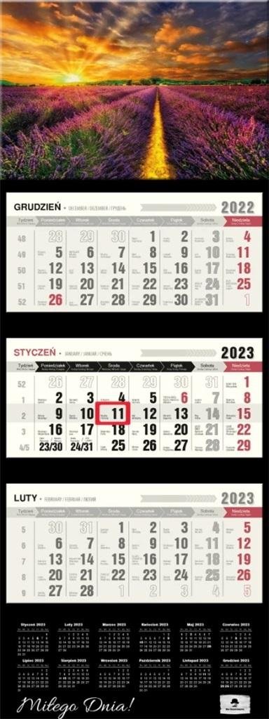 Kalendarz trójdzielny PREMIUM z wypukłą główką, format 315/810 mm, główka z otworem wierconym, klasyczny układ trzech kalendariów z przesuwanym okienkiem, kalendarium wyraźne i czytelne z dużymi cyframi, posiada miejsce do notowania, dodatkowo nazwy miesięcy i dni tygodnia w języku EN, DE, UA, dodatkowo przedłużone plecki ze skróconym kalendarium na 2023 rok.