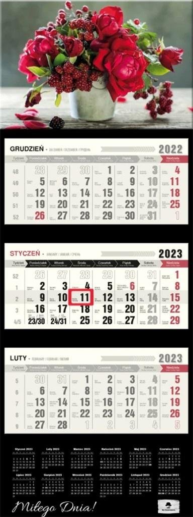 Kalendarz trójdzielny PREMIUM z wypukłą główką, format 315/810 mm, główka z otworem wierconym, klasyczny układ trzech kalendariów z przesuwanym okienkiem, kalendarium wyraźne i czytelne z dużymi cyframi, posiada miejsce do notowania, dodatkowo nazwy miesięcy i dni tygodnia w języku EN, DE, UA, dodatkowo przedłużone plecki ze skróconym kalendarium na 2023 rok.