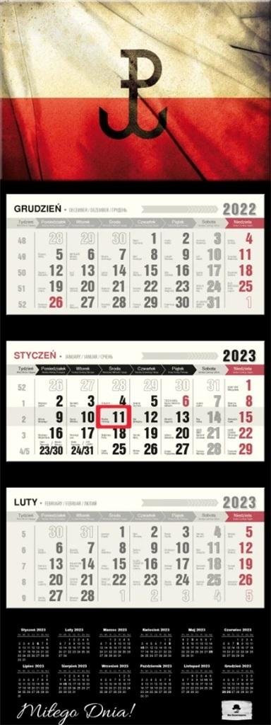Kalendarz trójdzielny PREMIUM z wypukłą główką, format 315/810 mm, główka z otworem wierconym, klasyczny układ trzech kalendariów z przesuwanym okienkiem, kalendarium wyraźne i czytelne z dużymi cyframi, posiada miejsce do notowania, dodatkowo nazwy miesięcy i dni tygodnia w języku EN, DE, UA, dodatkowo przedłużone plecki ze skróconym kalendarium na 2023 rok.