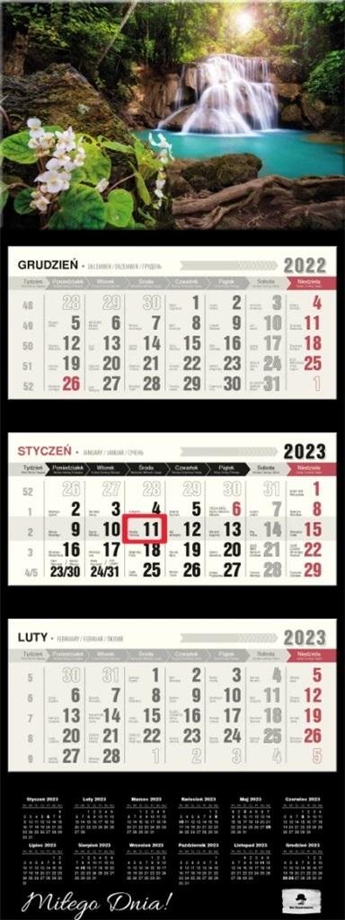 Kalendarz trójdzielny PREMIUM z wypukłą główką, format 315/810 mm, główka z otworem wierconym, klasyczny układ trzech kalendariów z przesuwanym okienkiem, kalendarium wyraźne i czytelne z dużymi cyframi, posiada miejsce do notowania, dodatkowo nazwy miesięcy i dni tygodnia w języku EN, DE, UA, dodatkowo przedłużone plecki ze skróconym kalendarium na 2023 rok.