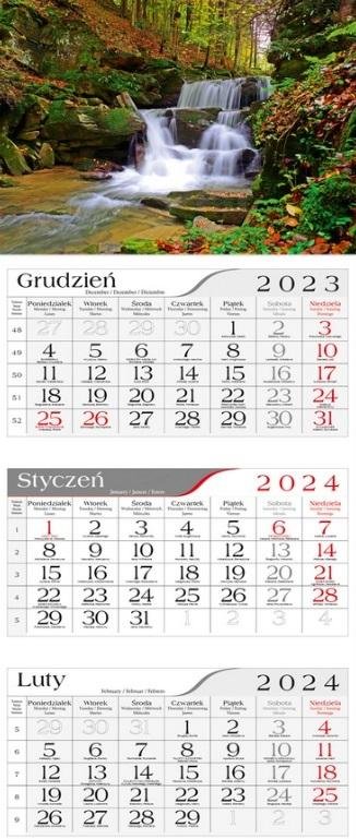 Kalendarz 2024 Trójdzielny StrumieńKALENDARZ TRÓJDZIELNY STANDARDOWYwymiar całkowity 320 x 863 mmpasek z okienkiemGŁÓWKAwymiar 320 x 228 mmz efektem wypukłościdruk 4/0 + folia błyskPLECYwymiar 295 x 590 mmkolor białyKALENDARIUM - T11wymiar 280 x 138 mm x 3, białyz numeracją tygodni i polskimi...