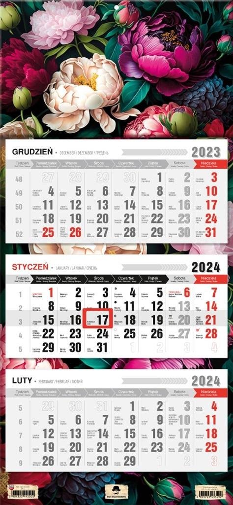 Kalendarz Trójdzielny z płaską główką. Format 315/680mm. Trzy komplety klasycznych kalendariów z przesuwnym okienkiem. Główka z otworem wierconym. Dodatkowo nazwy miesiąca i dni tygodnia w języku Ukraińskim, Angielskim i Niemieckim. Kalendarium dodatkowo zawiera fazy księżyca i znaki zodiaku. Dużo miejsca do notowania, czytelne duże litery i cyfry.