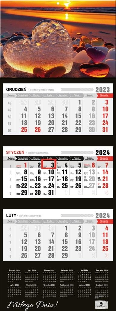 Kalendarz Trójdzielny PREMIUM Z WYPUKŁĄ GŁÓWKĄ. Format 315/810mm. Trzy komplety klasycznych kalendariów z przesuwnym okienkiem. Główka z otworem wierconym. Dodatkowo nazwy miesiąca i dni tygodnia w języku Ukraińskim, Angielskim i Niemieckim. Kalendarium dodatkowo zawiera fazy księżyca i znaki zodiaku. Dużo miejsca do notowania, czytelne duże litery i cyfry. DODATKOWO PRZEDŁUŻONE PLECKI KOLOREM DOPASOWANE DO WZORU ZE SKRÓCONYM KALENDARIUM NA ROK 2024.
