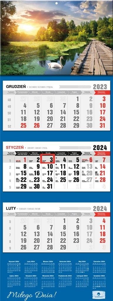Kalendarz Trójdzielny PREMIUM Z WYPUKŁĄ GŁÓWKĄ. Format 315/810mm. Trzy komplety klasycznych kalendariów z przesuwnym okienkiem. Główka z otworem wierconym. Dodatkowo nazwy miesiąca i dni tygodnia w języku Ukraińskim, Angielskim i Niemieckim. Kalendarium dodatkowo zawiera fazy księżyca i znaki zodiaku. Dużo miejsca do notowania, czytelne duże litery i cyfry. DODATKOWO PRZEDŁUŻONE PLECKI KOLOREM DOPASOWANE DO WZORU ZE SKRÓCONYM KALENDARIUM NA ROK 2024.