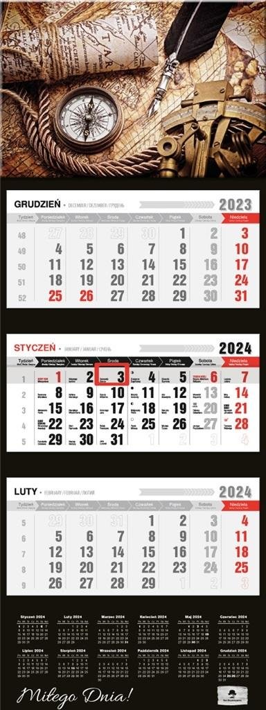 Kalendarz Trójdzielny PREMIUM Z WYPUKŁĄ GŁÓWKĄ. Format 315/810mm. Trzy komplety klasycznych kalendariów z przesuwnym okienkiem. Główka z otworem wierconym. Dodatkowo nazwy miesiąca i dni tygodnia w języku Ukraińskim, Angielskim i Niemieckim. Kalendarium dodatkowo zawiera fazy księżyca i znaki zodiaku. Dużo miejsca do notowania, czytelne duże litery i cyfry. DODATKOWO PRZEDŁUŻONE PLECKI KOLOREM DOPASOWANE DO WZORU ZE SKRÓCONYM KALENDARIUM NA ROK 2024.