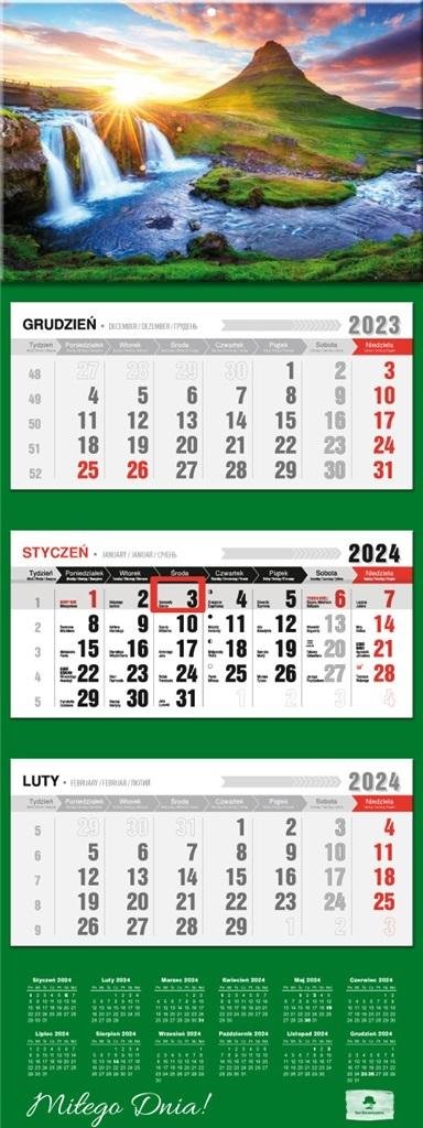 Kalendarz Trójdzielny PREMIUM Z WYPUKŁĄ GŁÓWKĄ. Format 315/810mm. Trzy komplety klasycznych kalendariów z przesuwnym okienkiem. Główka z otworem wierconym. Dodatkowo nazwy miesiąca i dni tygodnia w języku Ukraińskim, Angielskim i Niemieckim. Kalendarium dodatkowo zawiera fazy księżyca i znaki zodiaku. Dużo miejsca do notowania, czytelne duże litery i cyfry. DODATKOWO PRZEDŁUŻONE PLECKI KOLOREM DOPASOWANE DO WZORU ZE SKRÓCONYM KALENDARIUM NA ROK 2024.