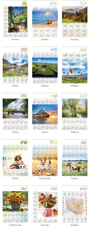 Specyfikacja    format kalendarza:60,7 x 88 cm;    pole pod nadruk:42 x 11 cm;    kalendarium:PL, EN, DE;    papier:kreda błysk 170 g/m2;    introligatorka:srebrne, metalowe listwy; dziurka do zawieszania    waga 1 egz.:135 g;Zawiera po jednym egzemplarzu wzorów:PL1 WidokPL2 PlażaPL3 JesieńPL4...