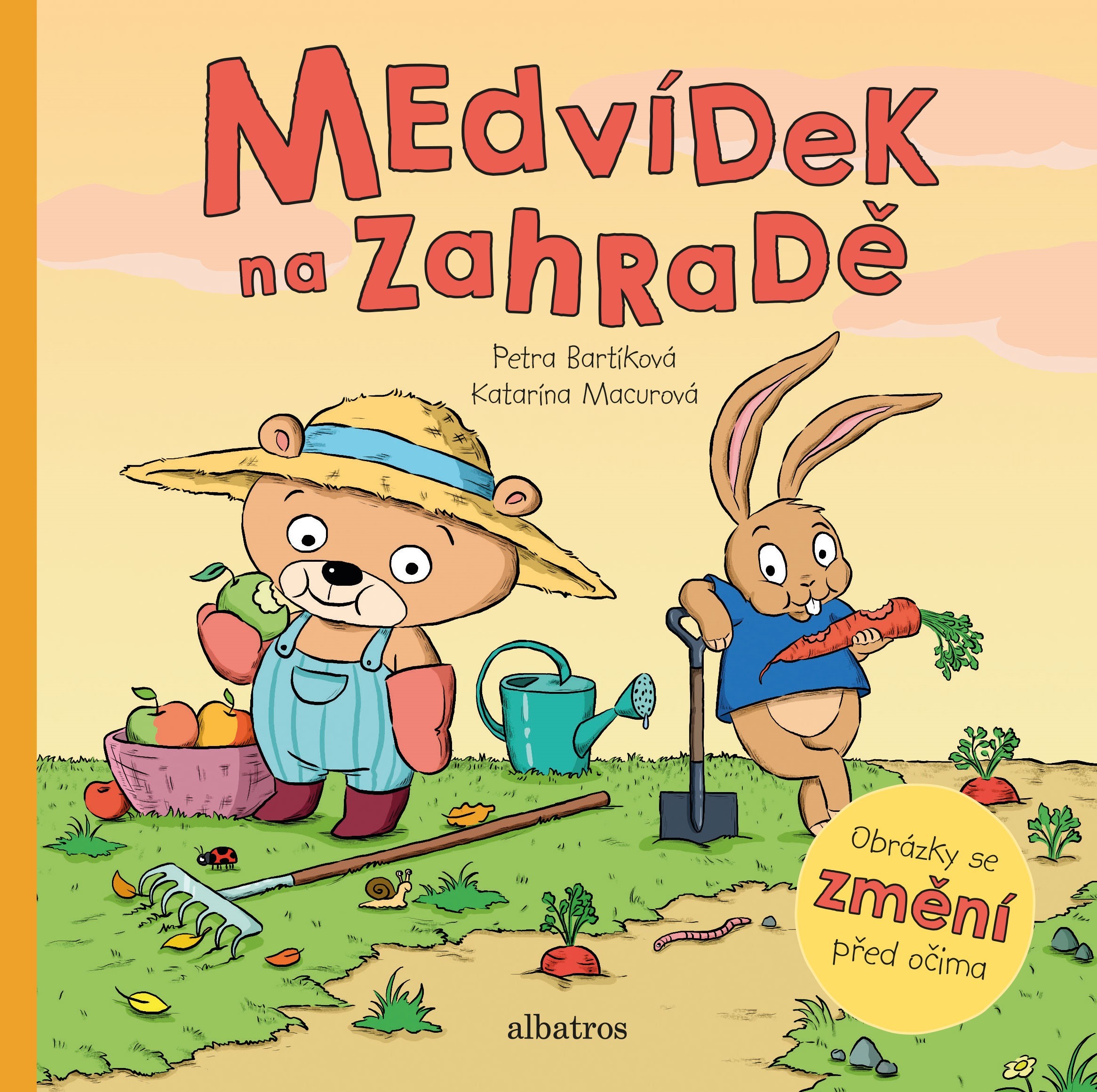 V létě na zahradě zrají jahody. Medvídek se o ně dobře stará. Jsou červené a sladké. Uf, to je horko! Kde je medvídkův klobouk? A kdo mu snědl mrkev? Pojď s medvídkem a s jeho kamarádem zajícem na zahradu. Prožiješ s nimi spoustu legrace! Díky kouzelnému táhlu se ti změní obrázky přímo před očima.
