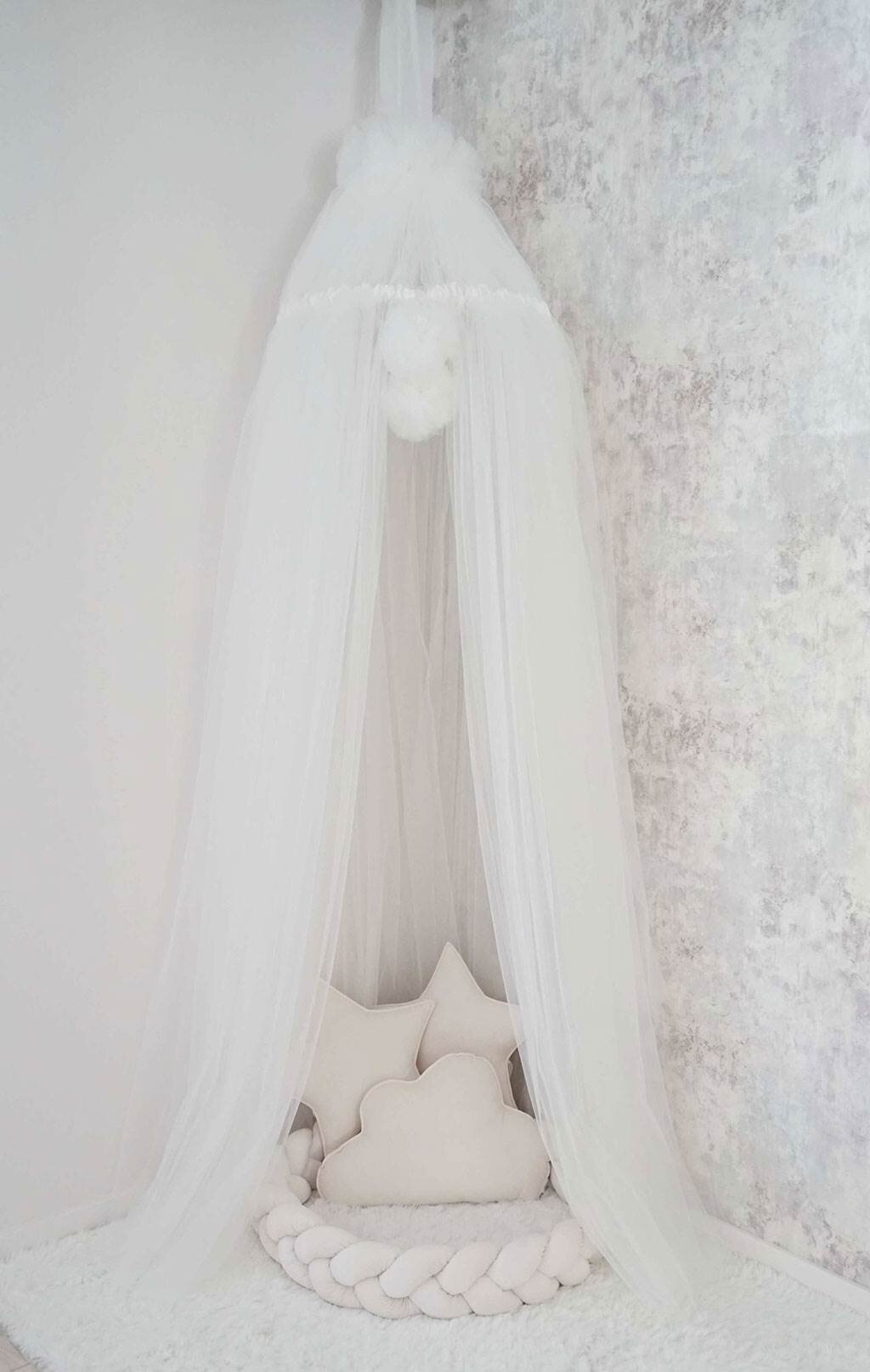 Závěsné stropní luxusní nebesa s bambulkami-baldachýn Belisima. Nebesa zavěšená nad posteli, nebo postýlkou zajistí klidný spánek bez nepříjemného hmyzu. Jsou velice užitečná v teplých letních dnech, nebo jako skvělá dekorace. Umožňují volný průchod vzduchu. Nebesa jsou zdobena krásnými...