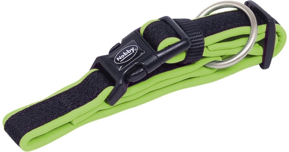 Kvalitní neoprénový obojek, který je šetrný k srsti psa, ale také rychle schne, když se pes v létě rád koupe. Vrchní vrstva z nylonu vzhledově připomíná síťku. Upevnění a pozice plastové silné spony zabraňuje jejímu přetížení. Kovový kroužek matném stříbrném provedení. Nastavitelná velikost: 25-35cm Šířka obojku: 15/20mm Barva zelená neon.