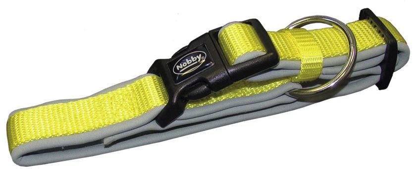 Kvalitní nylonový obojek podšitý neoprénovou vrstvou, která je šetrná k srsti psa, ale také rychle schne, když se pes v létě rád koupe. Vrchní nylonový materiál je prošitý se spodní neoprénovou vrstvou. Upevnění sponu zabraňuje jejímu přetížení. Nastavitelná velikost: 25-35cm Šířka obojku: 15/20mm Barva vrchní strana (nylon): žlutá Barva spodní strana (neoprén): šedá