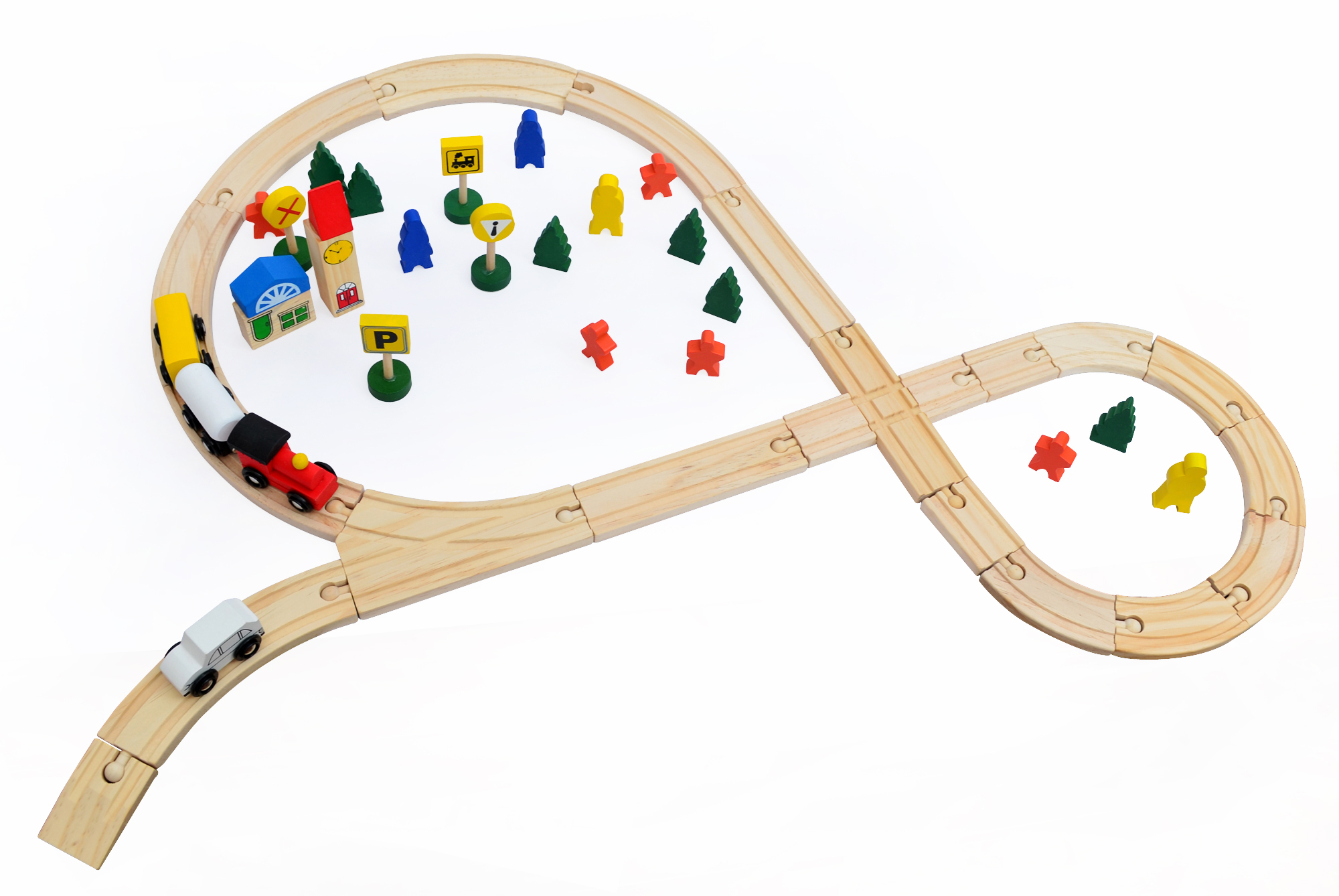Vlaková dráha set dřevo 48ks. Obsahuje dřevěné koleje, figurky, vláček s vagónky připojitelné pomocí magnetu, auto, budovu, dopravní značky. prečítať celé
