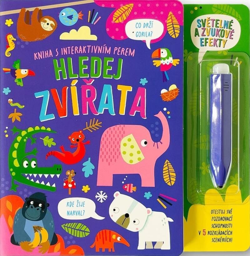 Kolik motýlů vidíš v džungli? Jakou barvu má mrož? A kde žijí jezevci? Rozkládací scenérie se zvířaty a otázky na jednotlivé obrázky otestují dětskou pozornost a manipulace s interaktivním perem procvičí jemnou motoriku. Po zatlačení hrotem pera na černý puntík v barevném kolečku se správnou odpovědí se rozezní melodie a rozsvítí zelené světlo, které děti potěší a povzbudí k hledání dalších správných odpovědí