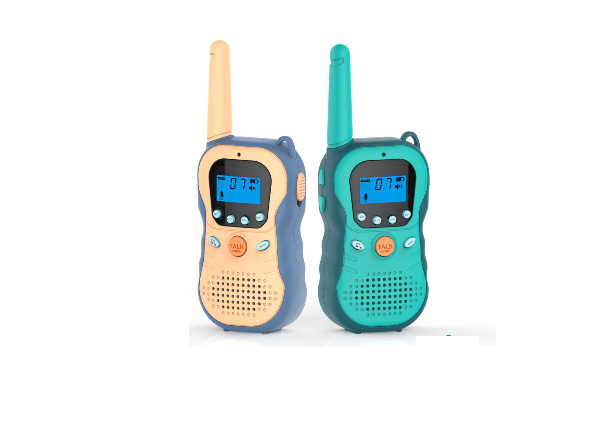 Vysílačky dětské. Rozměry 6x2,8x16 cm. Dosah až 3 km. Rádiové vlny. 4 druhy (normální, mužský, ženský, robotí). 8xAAA baterie (4xAAA do každé vysílačky) nejsou součástí. Přepínač ON/OFF na pravé straně vysílačky. Oranžové tlačítko - pro mluvení. Tlačítka ovládání hlasitosti (nahoru a dolů v menu)...