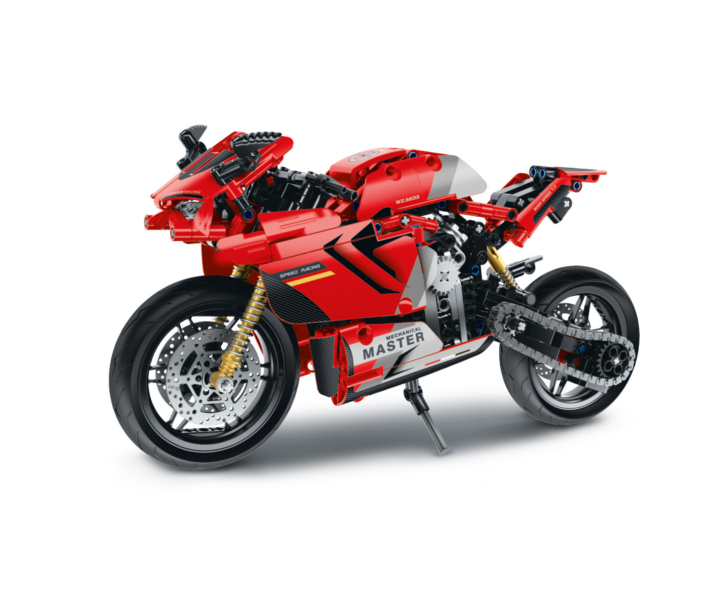 iM.Master Stavebnice motorka červená. Rozměry 32,2x10x16,6 cm. 557 dílků. Otáčecí zadní kolo s řetězem, fungující zadní tlumič. prečítať celé