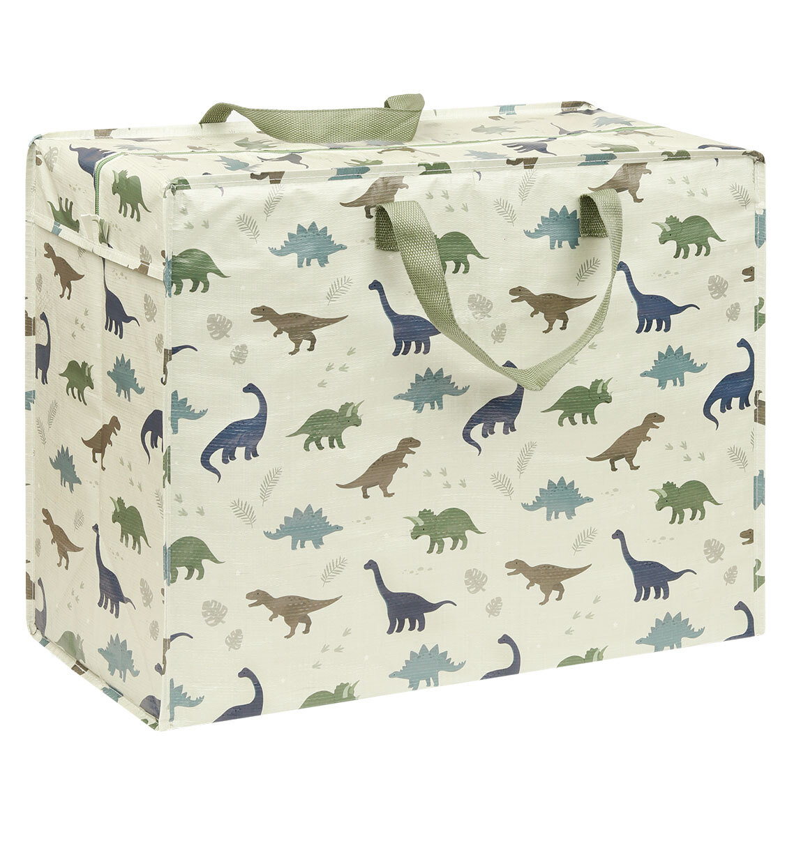 Velká úložná taška s potiskem dinosaurů je ideální pro skladování oblečení, přikrývek a hraček, ale lze ji také použít na pláž nebo do bazénu. Taška je vyrobena z recyklovaného plastu a zavírá se na zip. Tašku lze snadno složit, takže pokud jí zrovna nevyužíváte, nezabírá příliš místa.